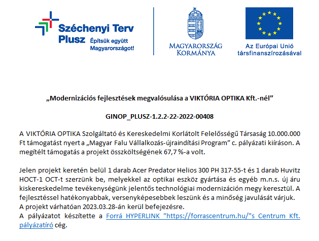 jún. 02 Modernizációs fejlesztések megvalósulása a Viktória Optika Kft.-nél Írta: Super User. Beküldve: Kezdőlap